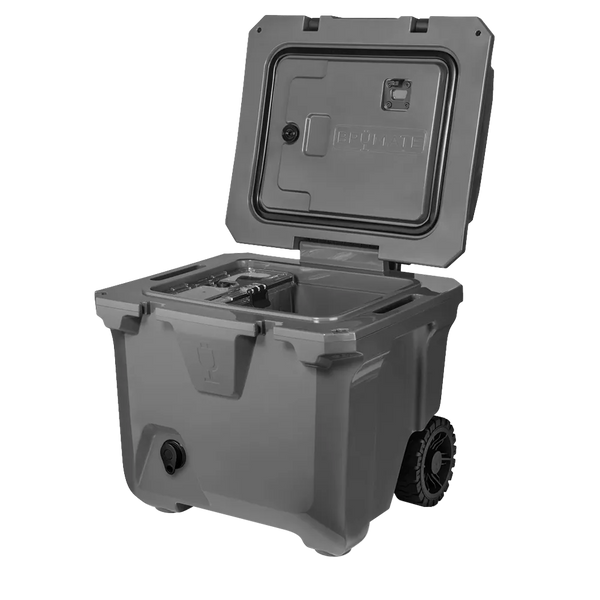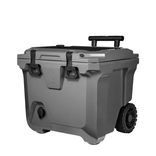 Now in a 30% lighter and compact size, the Brumate Brutank 35 QT Rolling Cooler makes it easier than ever to bring your drinks, cocktails, and snacks to backyard BBQ’s and weekend work events. The durable roto-molded insulation will retain ice for over 7 days and can fit plenty of 12 oz cans, bottles of wine, and bags of ice. Use the removable drink tank to mix up a cocktail and easily serve out of the built-in tap so you can keep your cooler closed and mess-free. The collapsible telescoping handle and all-terrain wheels allows you to traverse any ground area with ease.