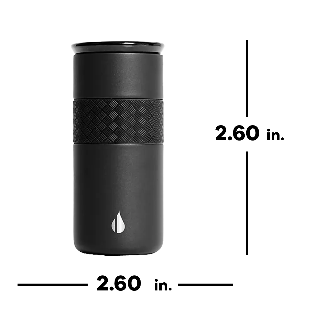 <ul><li>Triple-wall insulated stainless steel</li><li>Ceramic lid with spill-resistant silicone plug</li><li>Curved interior for easy cleaning</li><li>Textured grip band</li><li>Non-slip base</li><li>Cupholder friendly</li><li>BPA-free</li></ul>