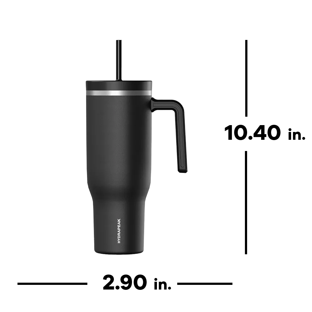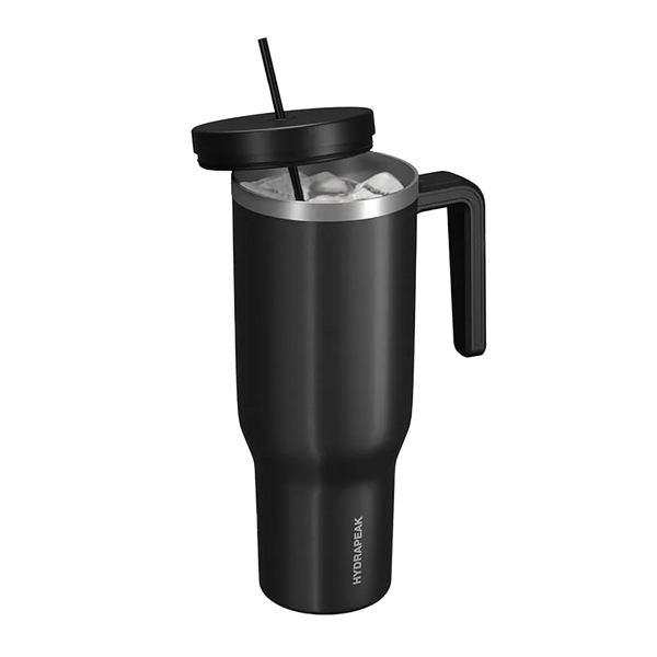 The Hydrapeak Voyager 40 oz is constructed with double-wall insulated stainless steel and will keep drinks ice cold for 30 hours and hot for 12. The grab and go side handle allows for a comfortable grip while sipping. The straw lid is spill proof and the non-slip rubber base will keep it upright. Take it with you anywhere with the cupholder friendly base.