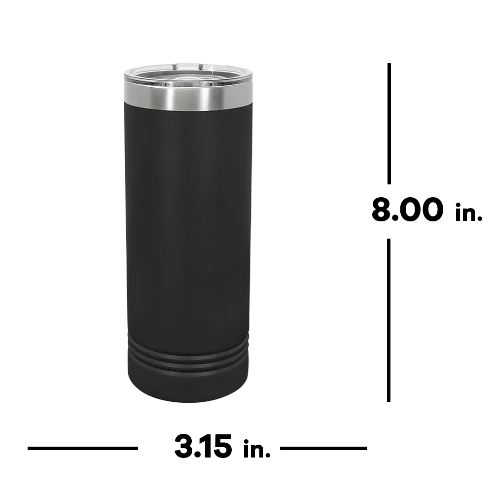 The same high endurance drinkware that Polar Camel has become known for is now available in a 22 oz. skinny tumbler. This tumbler is perfect for an easy grasp with smaller hands and is available in stainless steel and 16 vibrant powder coat finishes that beautifully showcases your clients logo in sleek laser engraving and vibrant color print. The included slider lid is spill-resistant and the cupholder friendly base allows for easy travel.
