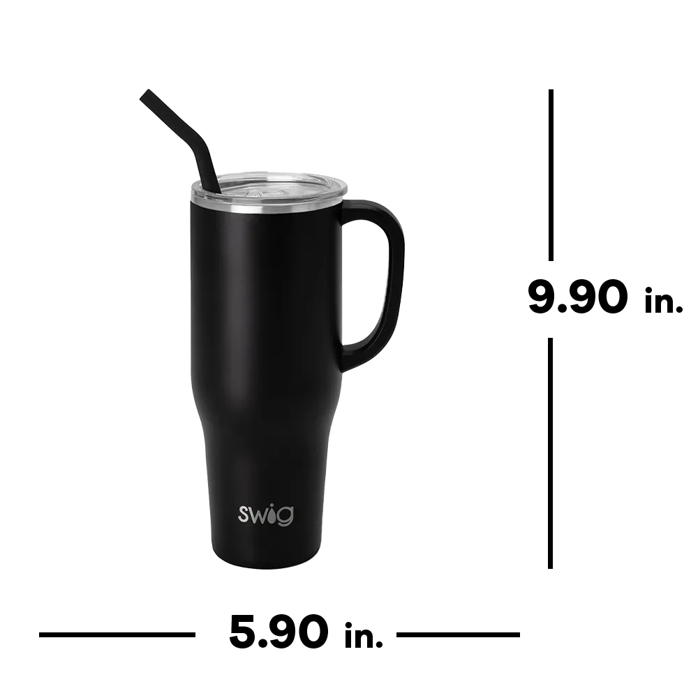 The Swig 40oz Mega Mug triple insulated, stainless steel construction keeps drinks cold for 24 hours and hot for 9. The cupholder friendly frame and comfort-grip handle makes this a travel mug that can go from home to the office with ease. The silicone flex-tip straw fits into the spill-resistant slider lid so you can sip on the go.